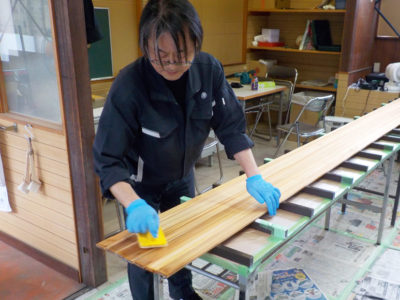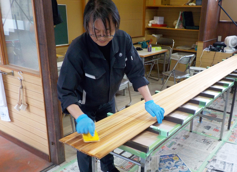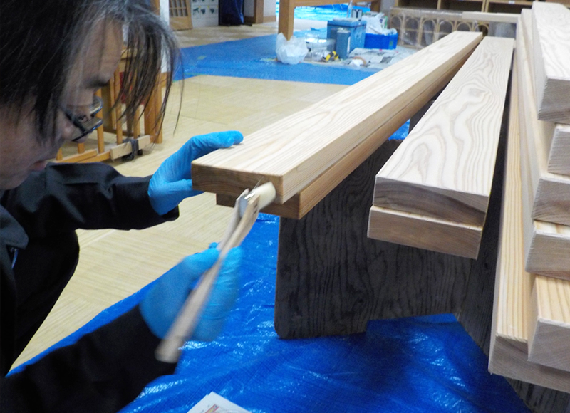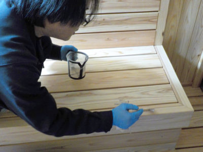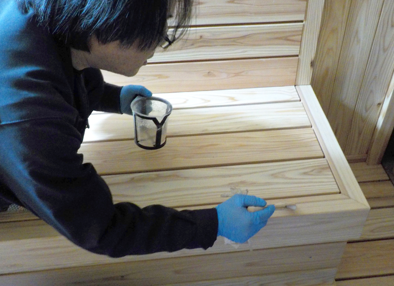 木材の発火を防ぐ製品はほかにもありますが、そうしたものは白くなって使えなくなってしまう(白華現象)。こうした問題をクリアしているところが当製品の大きな特徴です。