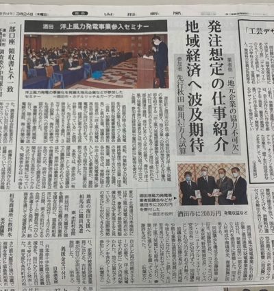 2022年3月23日に実施しました酒田市様への寄附金贈呈式と同一に開催した「洋上風力発電関連事業参入促進セミナー」の記事が山形新聞に掲載されました!