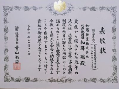 このたび、加藤総業株式会社は、酒田税務署より「優良申告法人」として表敬状を授与されました。